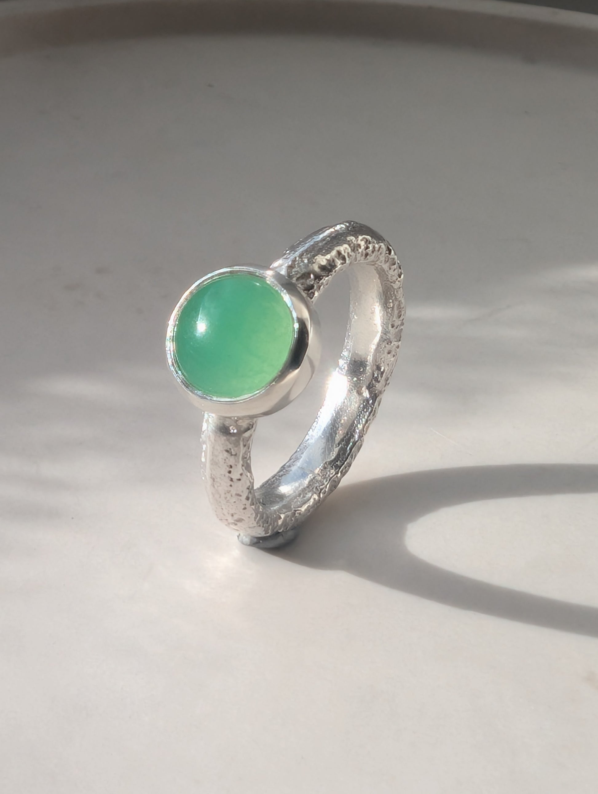 This ring features a chrysoprase, set in recycled silver. The textured band was created by sand casting with Gwithian beach sand. Creating an organic texture. The stone really looks like it glows from within.