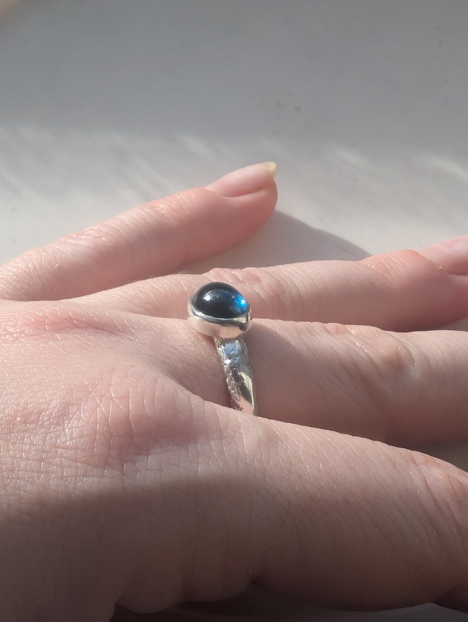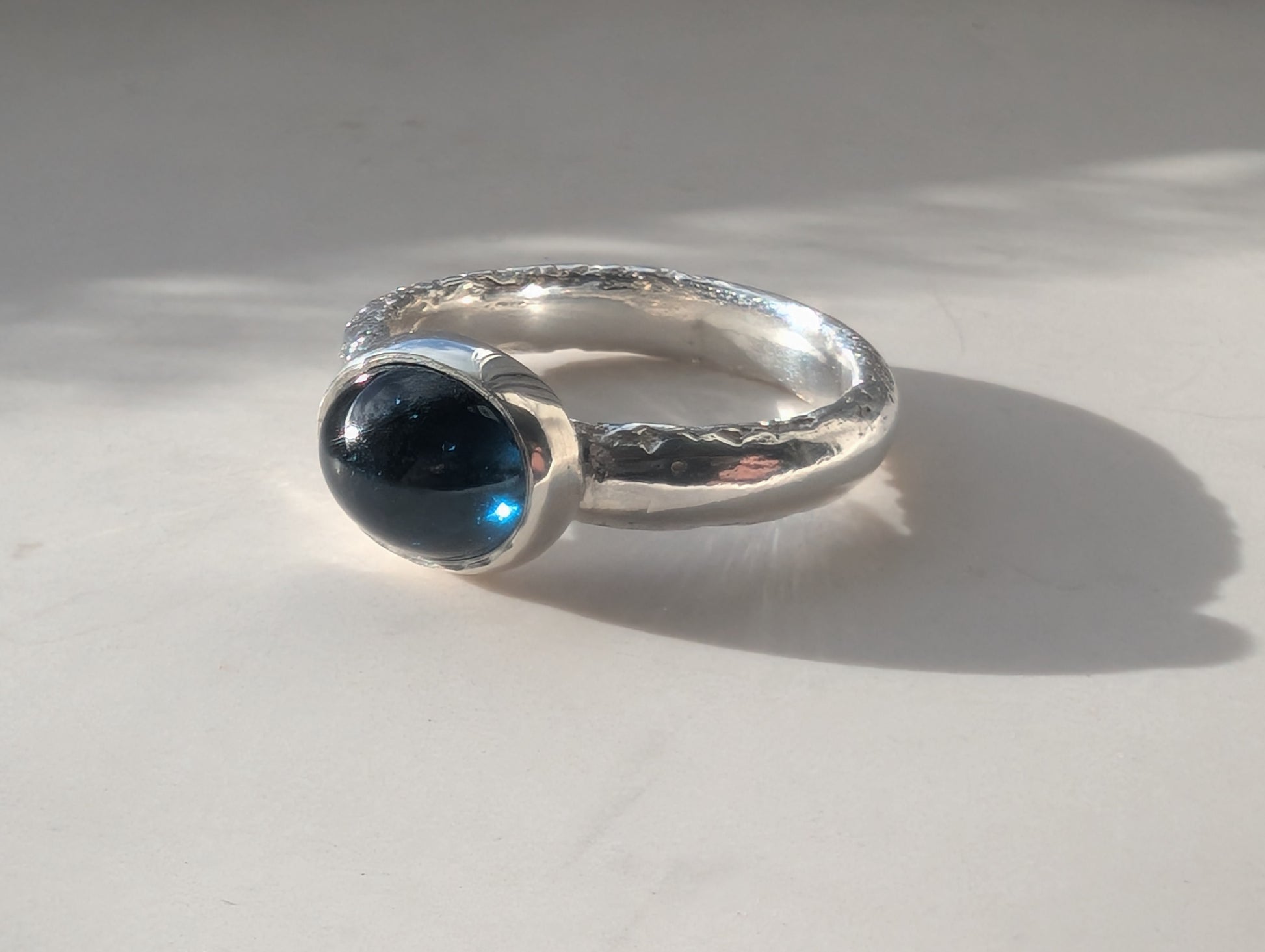 This ring features a dark blue tourmaline, the colour is hard to capture on camera but in sunlight you can see it shine. The stone is set in silver, and sits on a sand cast silver band. The unique texture on the band was created with Gwithian beach sand.
